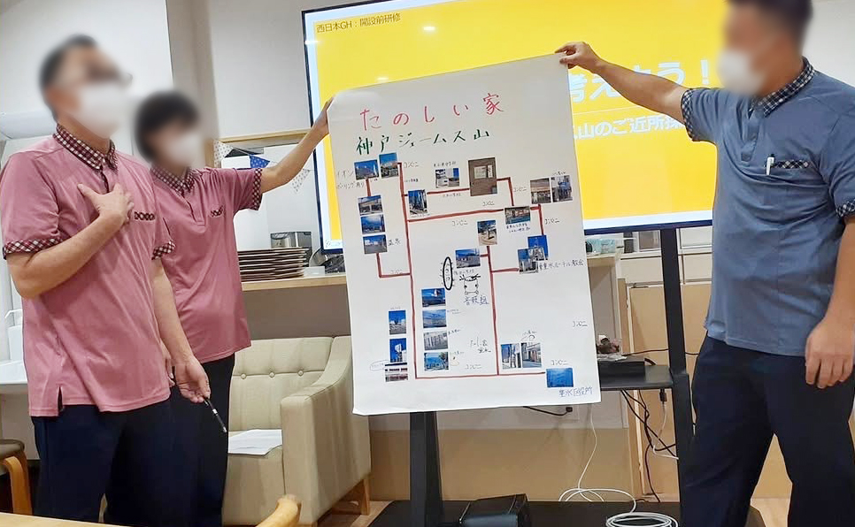 地域に根付いたサービスを展開したいということで… この日は事業所の周りにある地域資源の発掘を各グループに分かれて発表していただきました!!