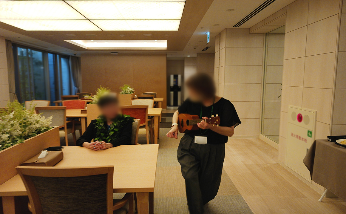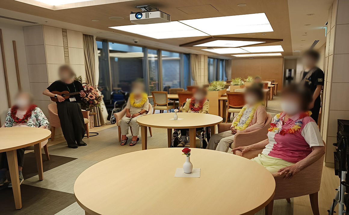 皆さまこんにちは 本日は藤原直子先生による音楽療法です♫ 今回は、ハワイの首飾りのレイを首にかけ、 ウクレレの演奏でハワイアン風に✨