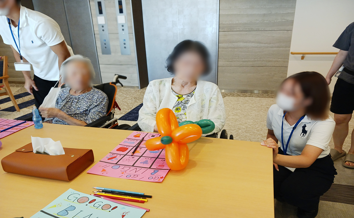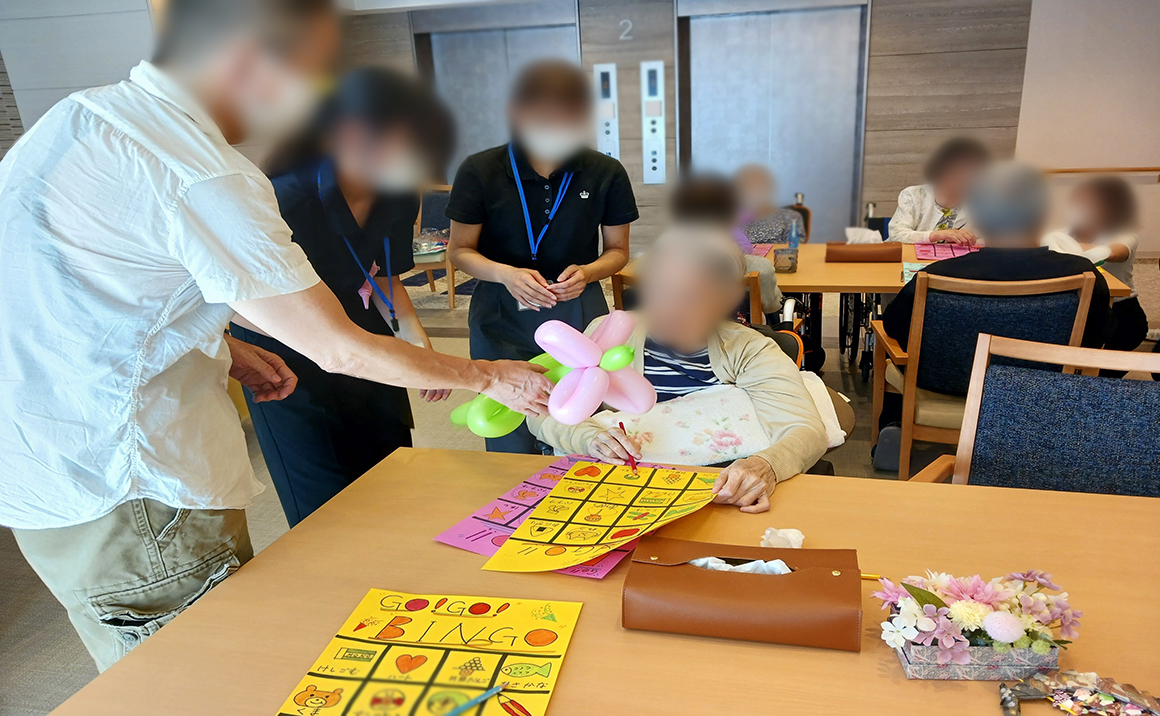 皆さまこんにちは 本日は、今月3組目の実習生による「GO GO BINGO」ゲームが行われました!! BINGO用のシートは数字ではなく、 皆さまに分りやすいようにとイラストを使って手作りしてくださいました💦 会場は大盛り上がりで、 BINGOの景品として、お花や動物のバルーンアートがプレゼントされました!