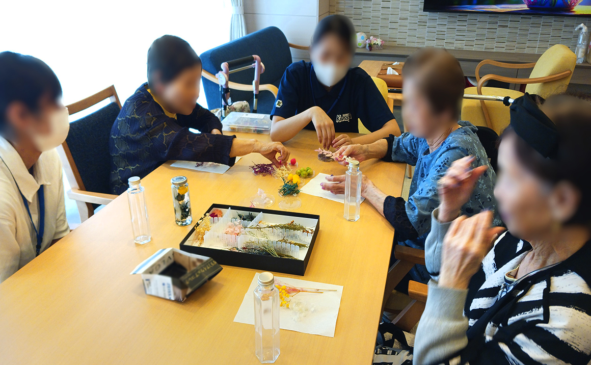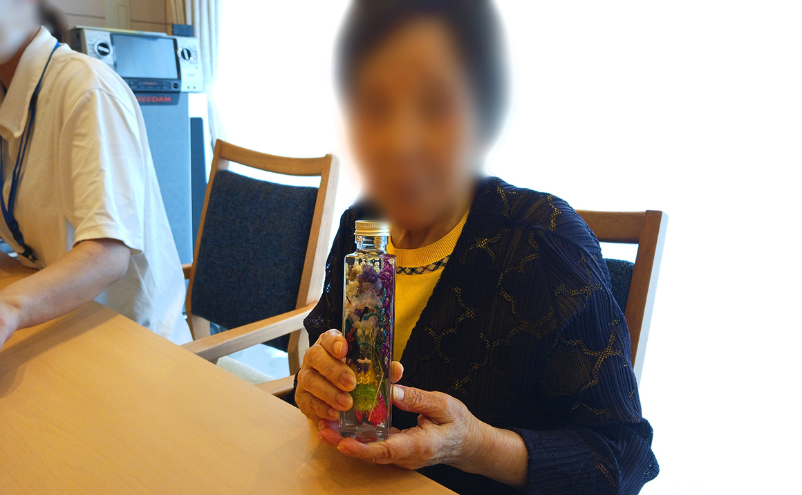 初めにお好きな瓶とドライフラワーを選んでいただきます。 ドライフラワーは、バランスを考え必要があればカットします。 次に、オイルの入った瓶にピンセットを使ってドライフラワー詰め込んでいきます! あとは、キャップをしっかりと閉めて完成♫ 皆さま、とっても素敵なハーバリウムが出来上がりました✨