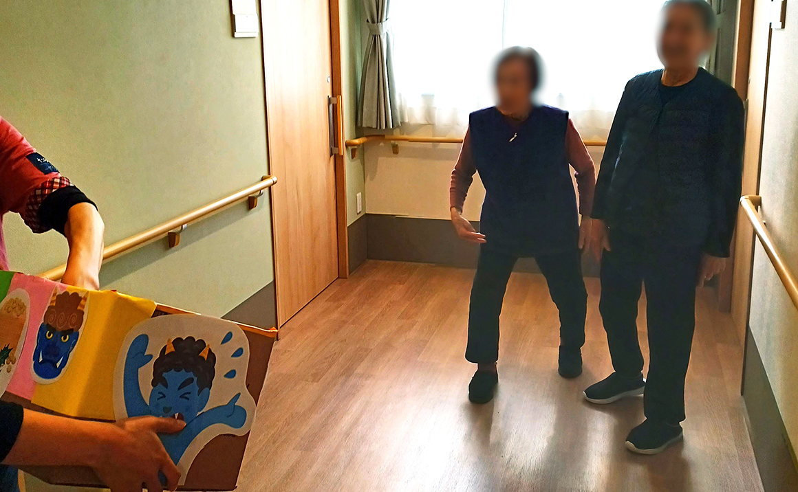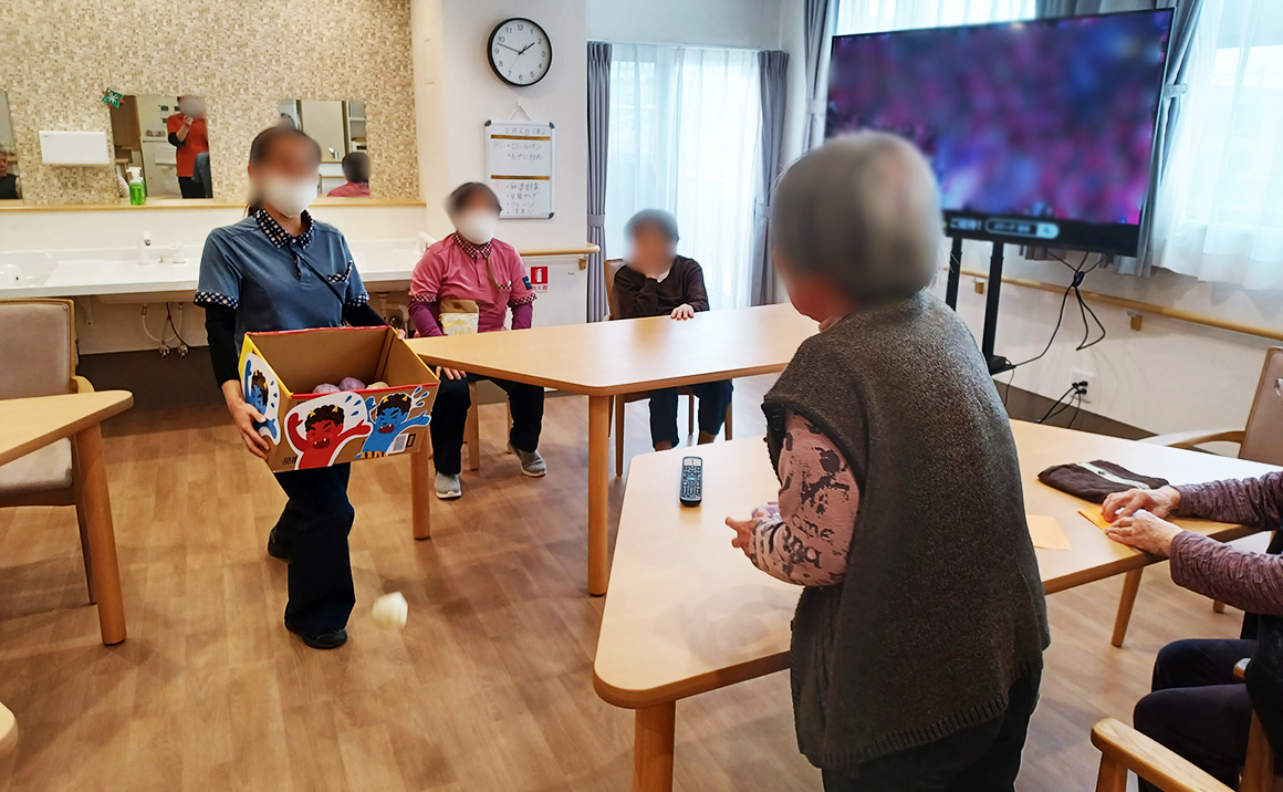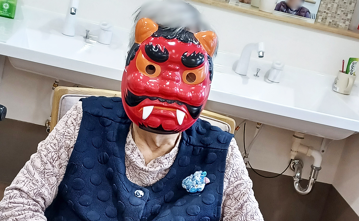「鬼は外、福は内」とやさしい声が広がり柔らかい紙の豆を投げます。鬼のお面を被り見てみんなで大笑い。
