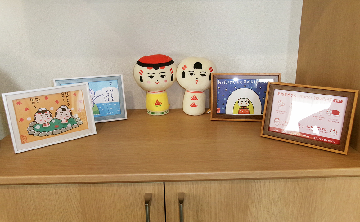 玄関には、仙台ならでは、ご当地キャラクターの仙台弁こけしちゃんをおかせて頂きました!