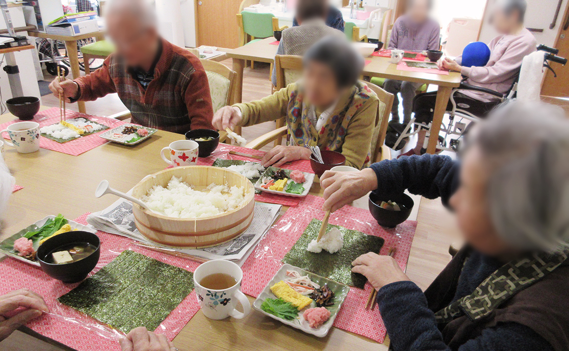 2月は入居者の皆様と恵方巻作りをしたり、カラオケ、ゲーム大会などをして過ごしました。 ちらし寿司作りは材料の調達から近隣のスーパーに出掛け、入居者と一緒に1から作成いたしました。 3月は梅、桜の季節となりますので近隣公園に散策し春を感じる時間を沢山創っていきたいと考えております。