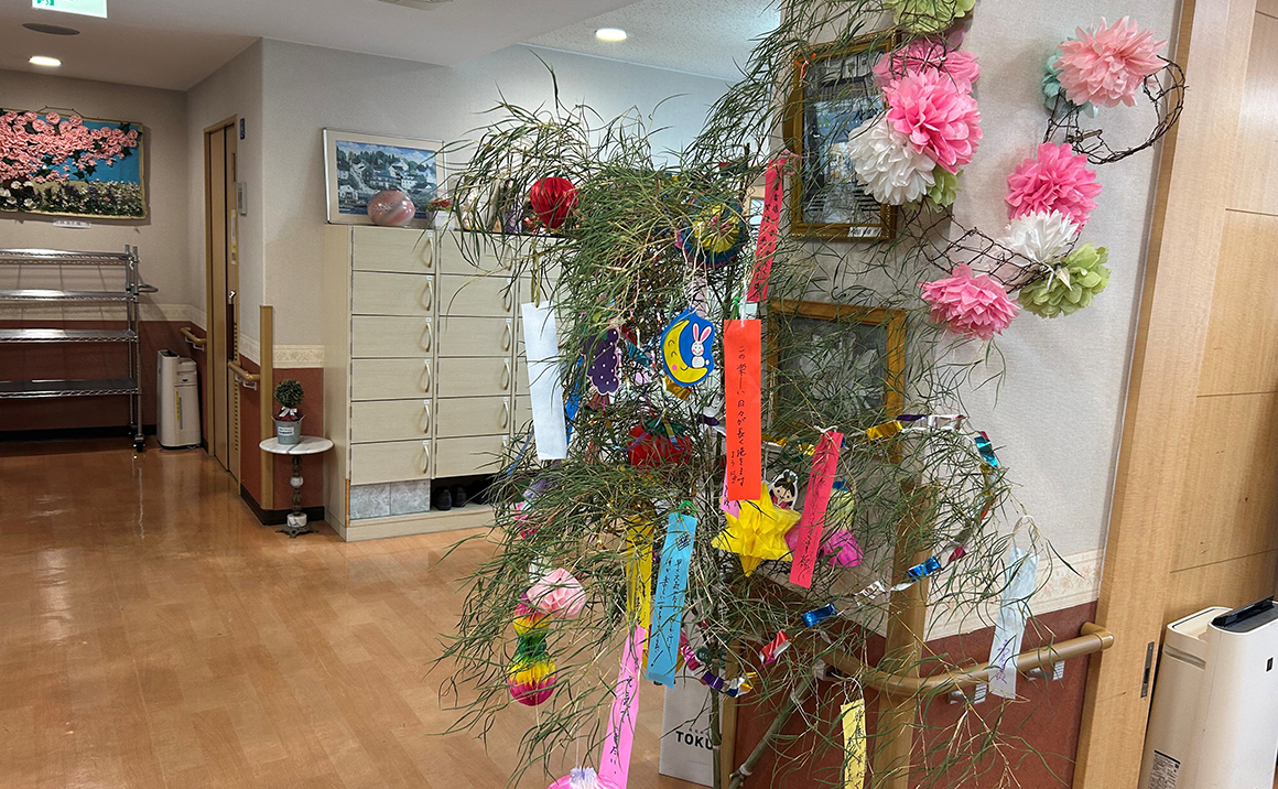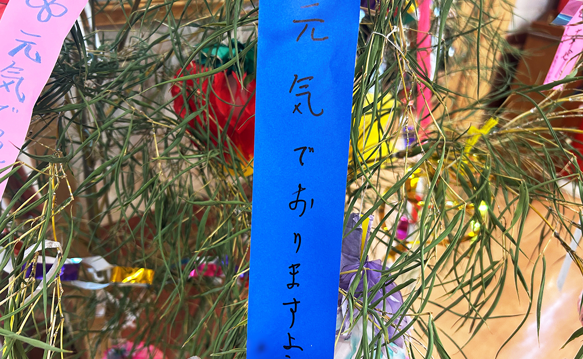 毎年地域の方のご厚意で今年も立派な笹が届きました。 両手いっぱいに笹を持って来てくれたご主人も「もうわし90歳やで!来年来れるかどうか。」 と汗いっぱいかいて、元気いっぱいの笑顔を見せてくださいました。 ご主人のおかげで今年も笹飾り出来ました。 皆さんのお願い叶うといいですね。