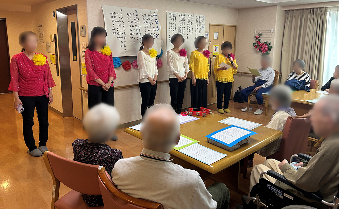 2か月に1度来て下さる、ボランティアグループの『フリージアさん』による歌体操がありました。 皆さんの知っている歌で合唱したり、体操したり。 皆さんのきれいな歌声にうっとり、衣装も素敵でした。 楽しそうに歌って下さるので、入居者様も笑顔になります。 ありがとうございました。