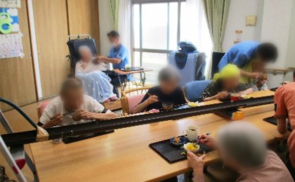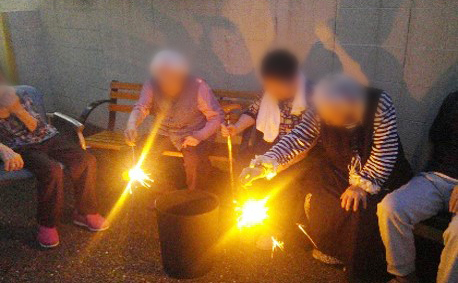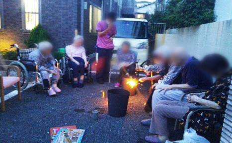 たのしい家東淀川相川で、夏の食べ物ということで、スタッフが準備をし、 流しそうめんレクをやりました。 レールを繋げて、水を流すと一気に本物のような趣に。 そうめんを流すと、「流れてきたわ」「そっち行ったでー」、「取れたわ」などと楽しんでおられました。 別の日には、夕暮れ時に外に出て花火をされました。 薄暗くなった空の下、燃える花火を見て「きれいね」と見入られてました。