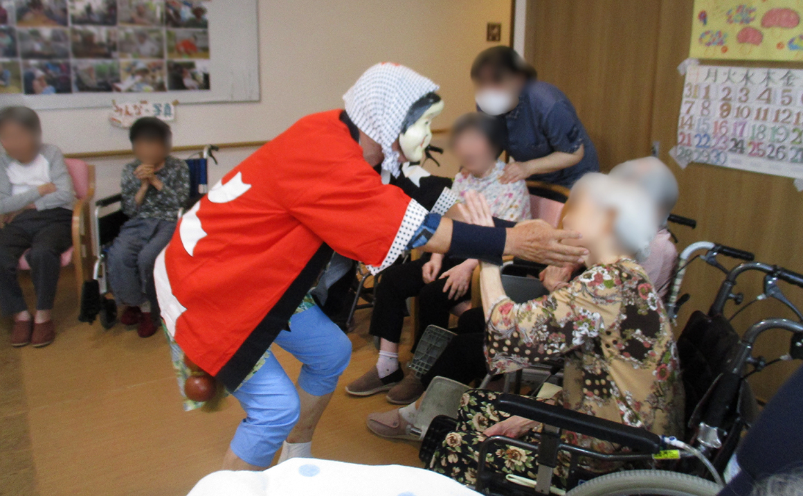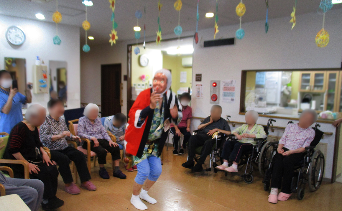 敬老の日に、たのしい家東淀川相川でお祝いのイベントを行いました。 全員で集まって、童謡や懐かしの歌を一緒に歌いました。 仕上げにはお待たせの、変なおじさん?のヘンテコ踊りの時間になりました。 手拍子に合わせての、キレのあるヘンテコ踊りに「なんやそれ~」と皆様笑顔になられてました。 踊りの後は1人1人記念撮影をし、良い記念になられました。