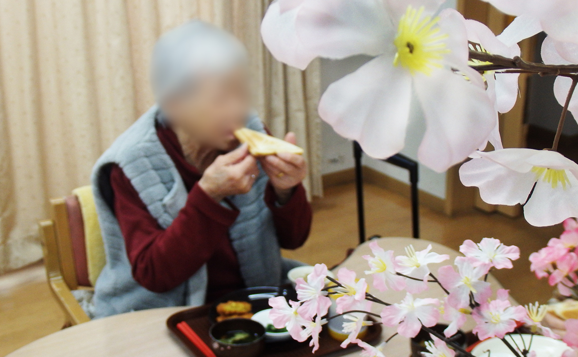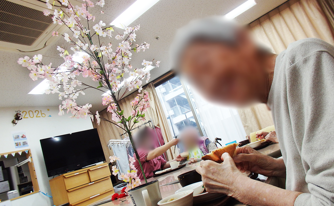 たのしい家 田辺 では桜の開花時期に合わせて施設内でお花見会をいたしました。 今年のお花見会のランチメニューは ホットサンド を召し上がっていただきました。 お出汁とマヨネーズで味付けしたシーチキンとスライスチーズを挟んで焼き上げました。 テーブルの中心にお花を配置して皆様で囲んで召し上がっていただきました。