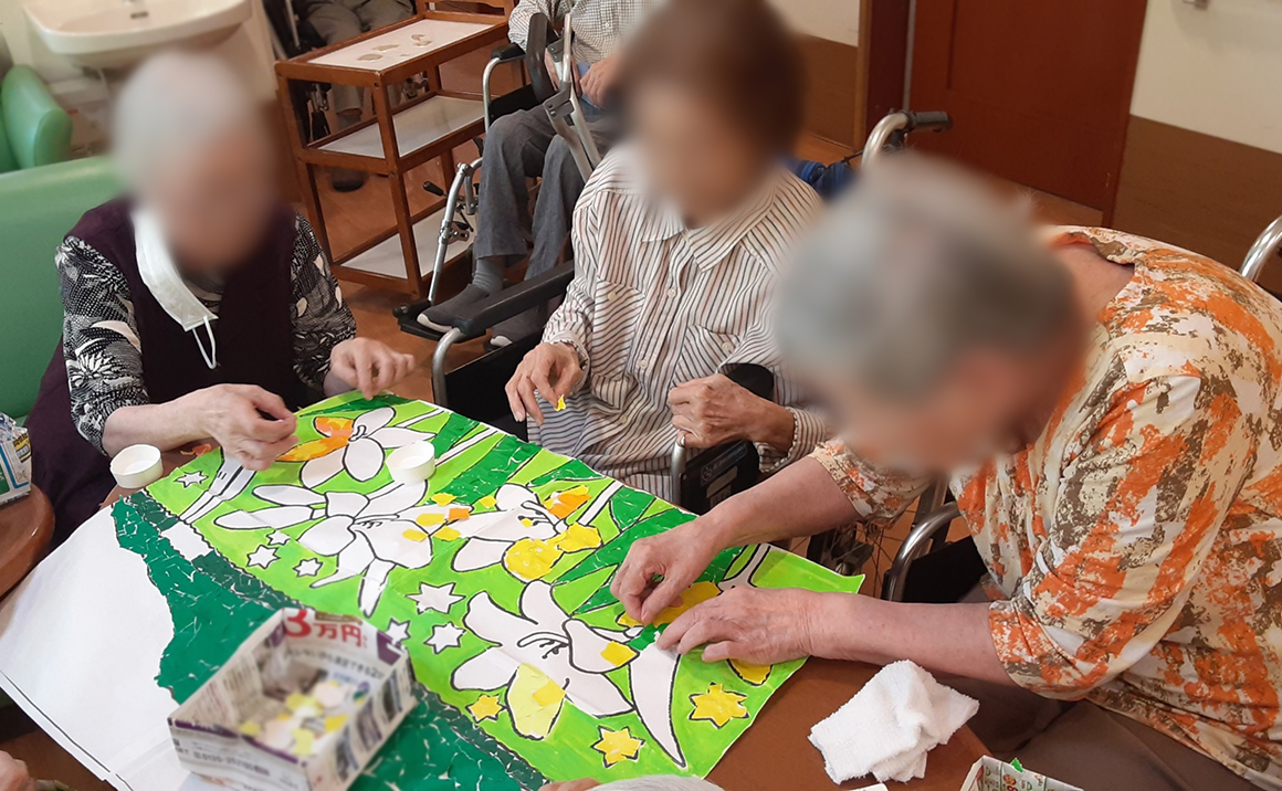 スタッフが下絵を準備して、入居者様には折り紙を破って頂き貼り絵の準備を行い、 準備が整ったら下絵にあう色を選んで色紙を貼って頂きました。
