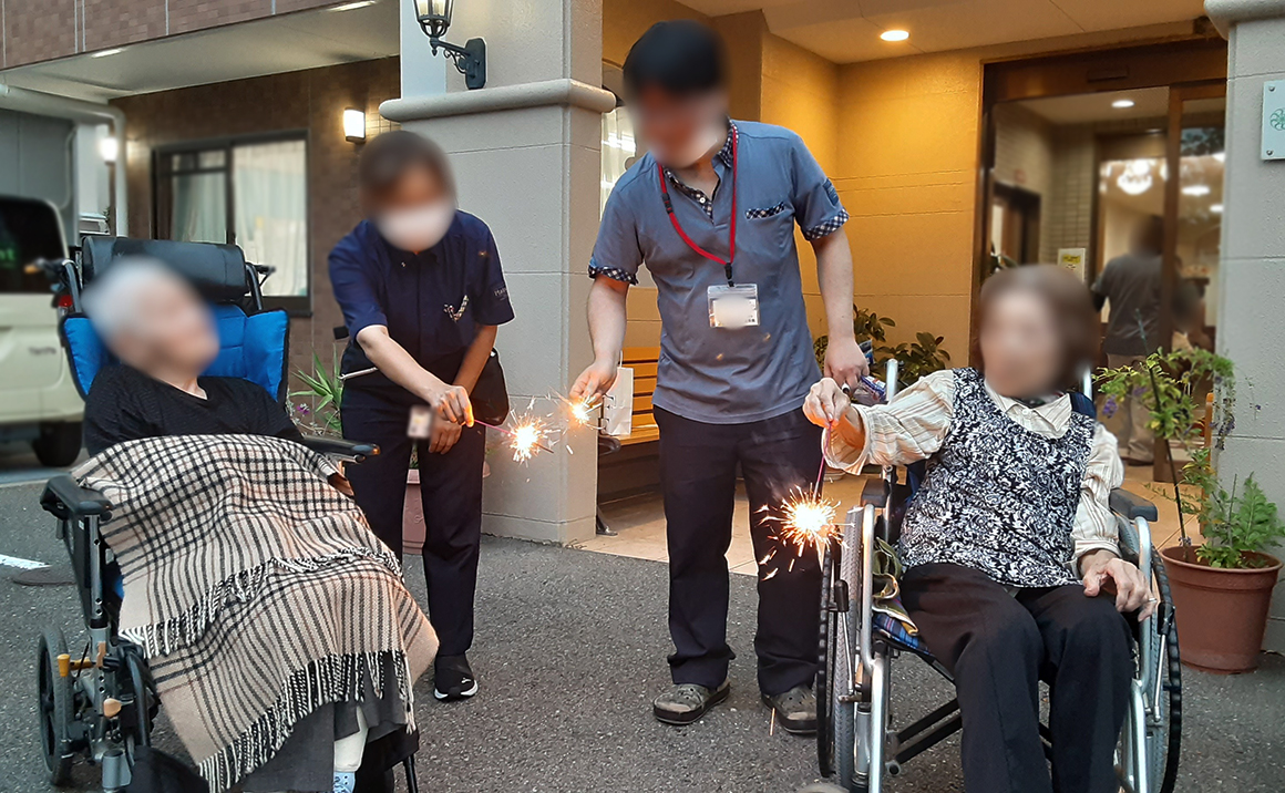 こんにちは。プレザンメゾン寝屋川です。 9/23(火)の夕食後に施設の前のガレージで花火をしました。 38名の方に参加していただき、手持ち花火は体験して頂き、吹き出し花火は鑑賞して頂くことができました。