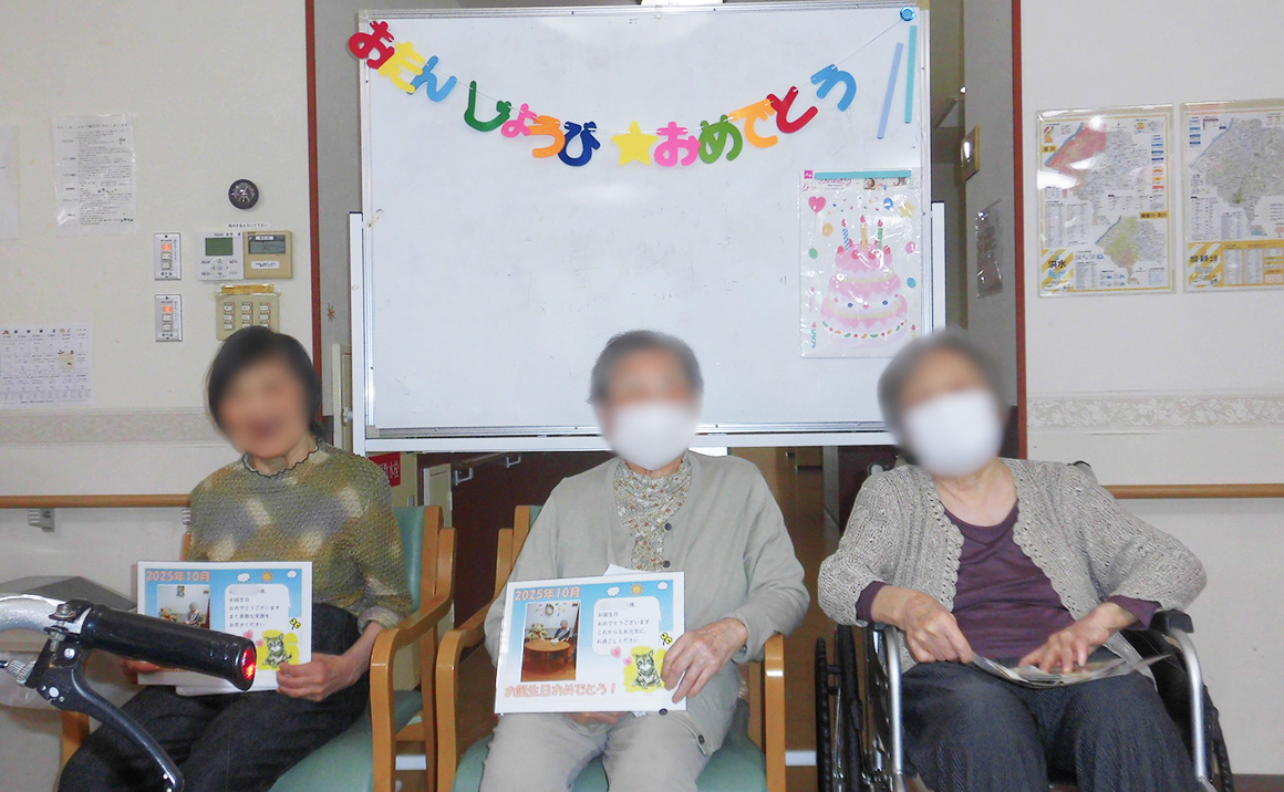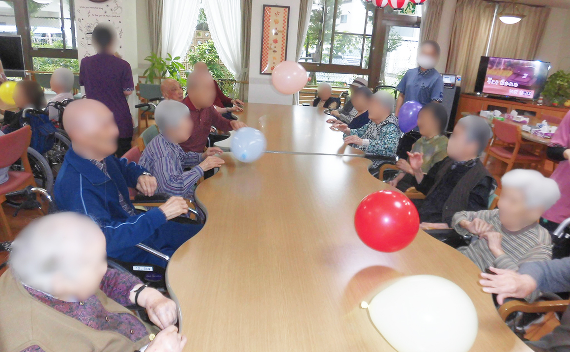 食堂にて皆様で風船バレーをした後、3名のお誕生日の方のお祝いをしました🎊 お誕生日会の日の昼食は、誕生月の方にリクエストを伺い、厨房と相談しメニューを決めています。 この日の昼食は