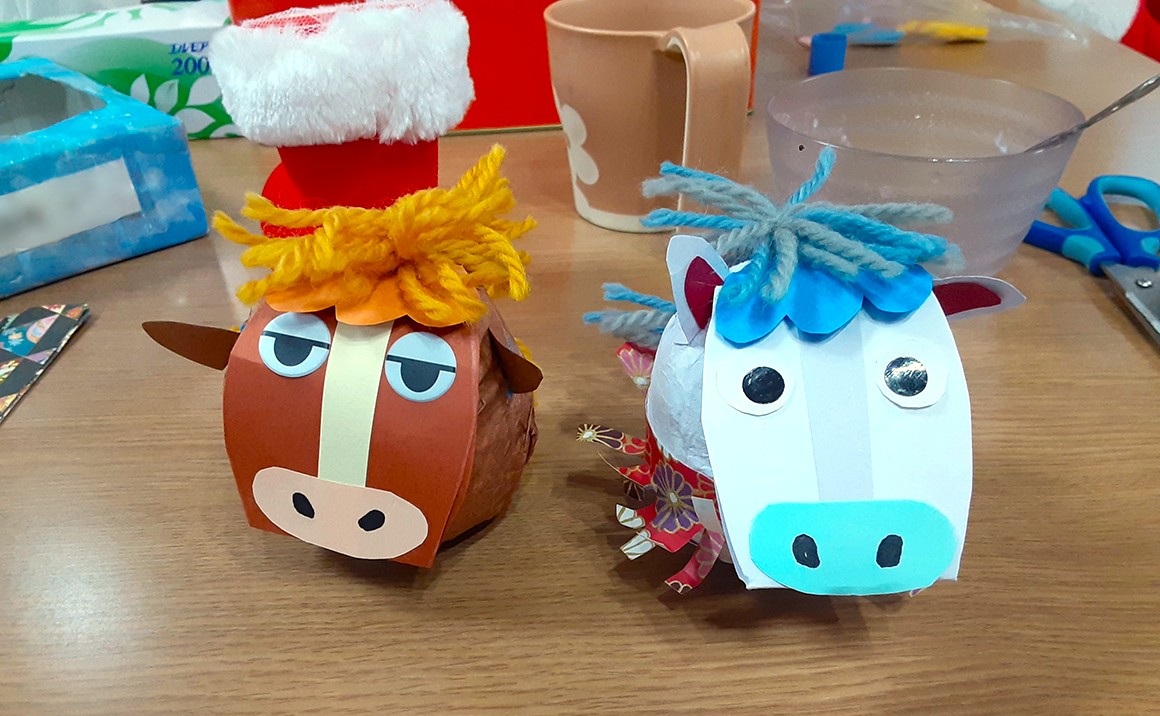 2025.12 もうあと少しで年が明ける・・・ 来年は🐎うま(午)年🐎ということで、 はりこの午つくりを行いました。 丸いカプセルに、しわしわにした和紙を貼って土台を作り、 顔や耳、しっぽ、たてがみなどを付けて完成させました。