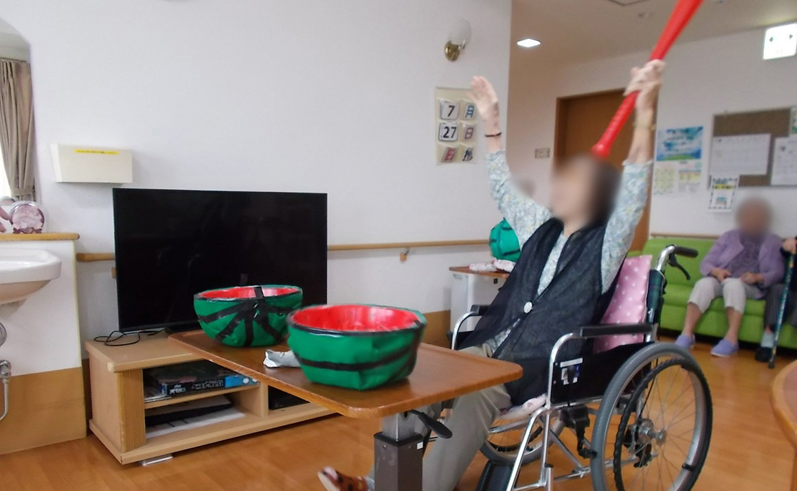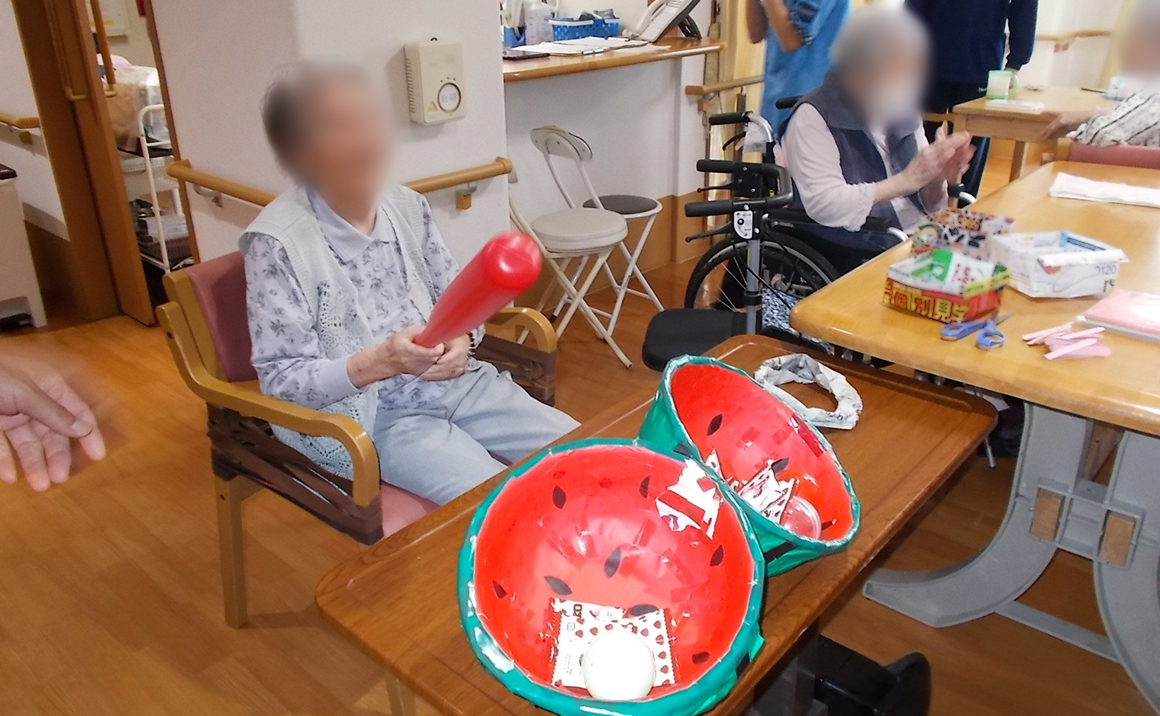 当日はスタッフの手作りスイカを順番に叩いて割っていただき、大盛り上がり! 中にはチョコを入れており、無事割れたご入居者様にプレゼント致しました。