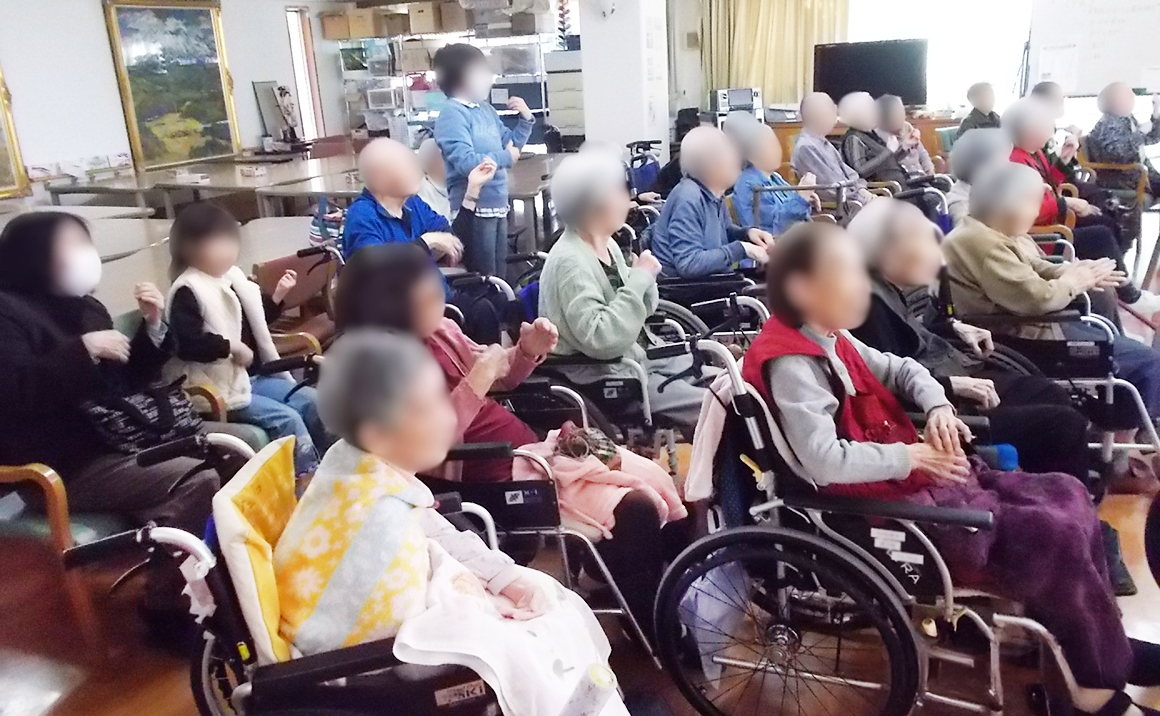 入居者様の皆様にフラダンスの手の動きを教えてもらい・・