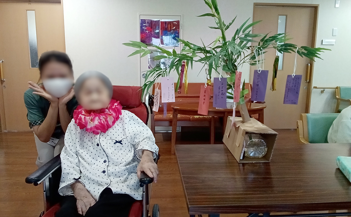 ご入居者様には短冊に願い事を書いていただきましたよ。 なにを書こうか悩まれなかなかペンが進まない方もいらっしゃいました。