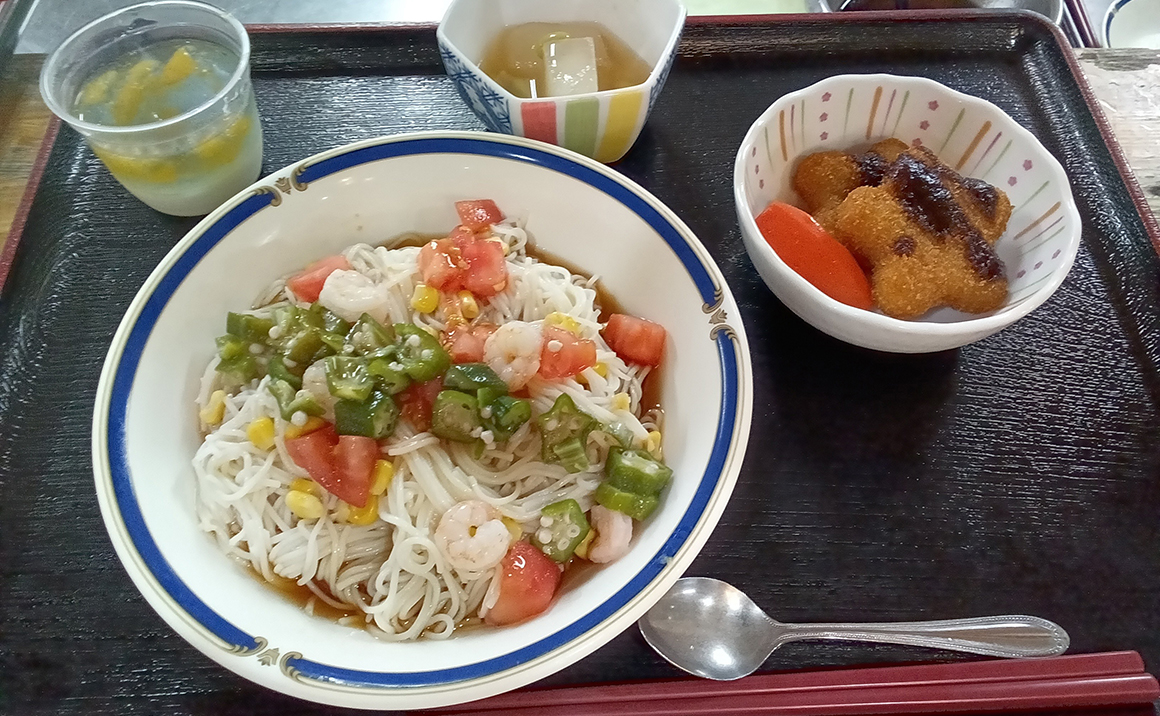 当日の昼食はカラフルなそうめん、星形のコロッケ、天の川をイメージしたゼリーが提供されました。
