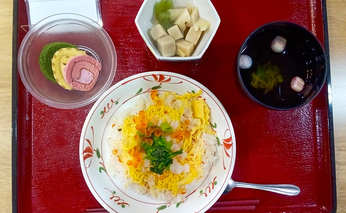 この日は桃の節句にちなんでちらし寿司を食べて、桃のジュースを飲みました。