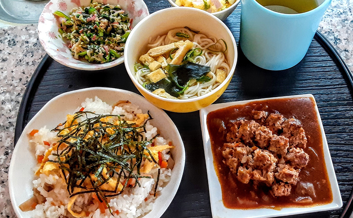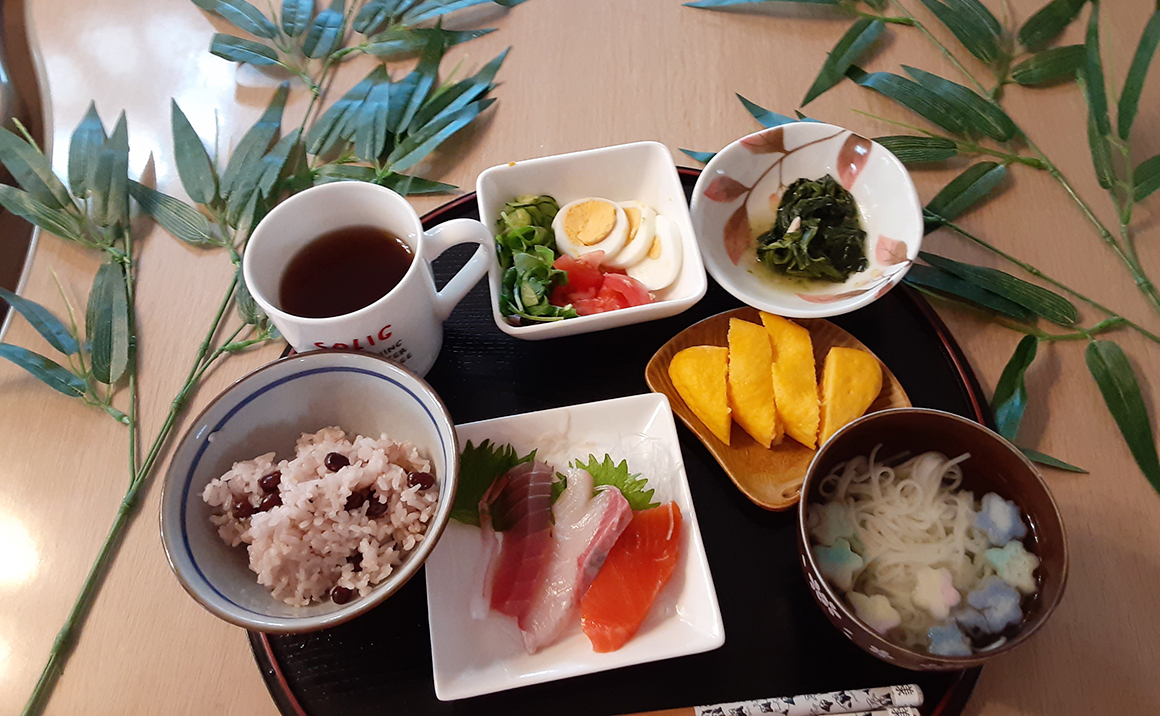 七夕の食事は、リクエストの刺身と赤飯、卵焼き、夏野菜サラダ、ソーメン汁(3F)・チラシ寿司、ハンバーグ、ソーメン、ほうれん草とえのき和え、ポテトサラダ(2F)