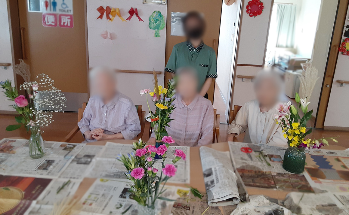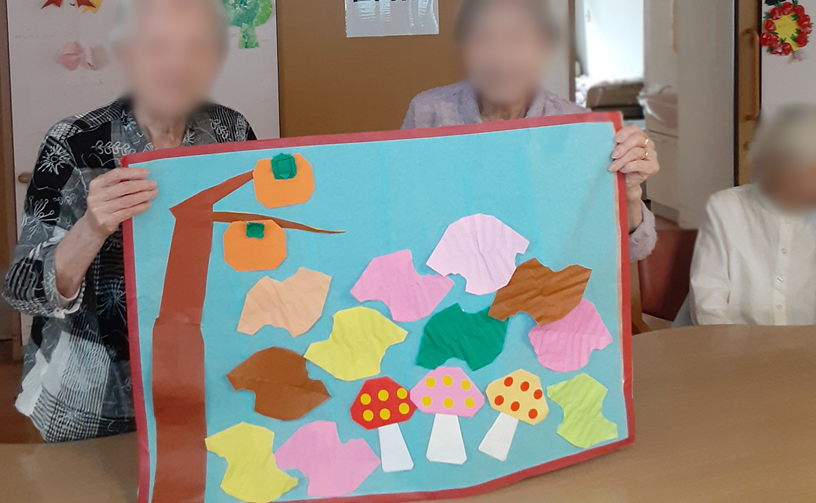10月の生け花では、今回は、ススキを入れて秋バージョンで飾ってみました。 自分で好きな花を選び思うように熱心に創作されていました。皆様、生花を手に取り、感動しながら満足そうなお顔でした。 作品つくりでは、柿・キノコ・葉っぱを色紙を使い皆さんで工夫して作品をつくりました。 折れ目を付け、葉っぱの形を変形させ虫食いの葉っぱをイメージしたり、木の枝ぶりをイメージしハサミでカット。 皆さんで、相談しながら作品作りを楽しんでおられました。