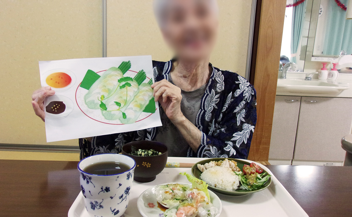 もう6月になりました。梅雨の季節です。皆様はお元気ですが、外が嫌な時期になりました。 外にも行けない、じめじめしたこの気持ちを吹き飛ばすにはやはりおいしい物を食べる事! おやつレクとしてどらやきや大きいゼリーを食レクとして生春巻きを皆でペロリと頂きました。 雨にも笑顔で負けずに夏の暑さも吹き飛ばしたいと思いますね!
