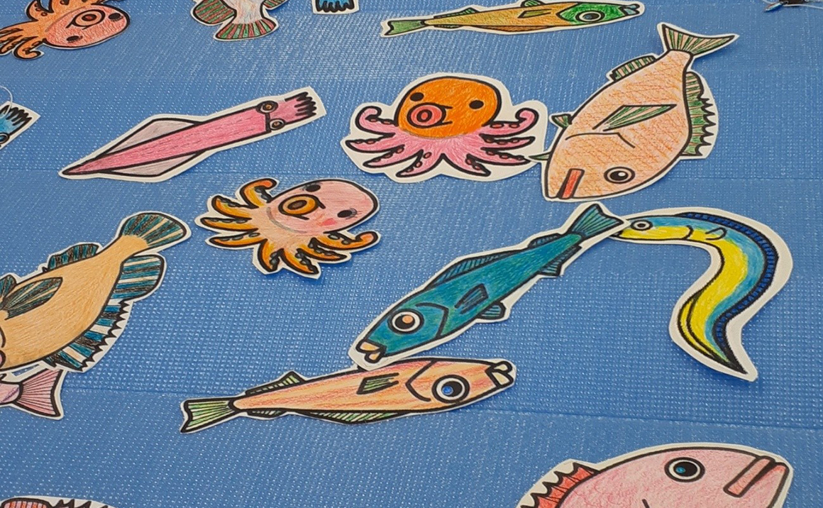今回の魚釣りゲームは8月終わりごろから皆様に色を塗っていただいて「熱帯魚やなぁ」「たべられへん」と言いながらカラフルなできあがりになりました。