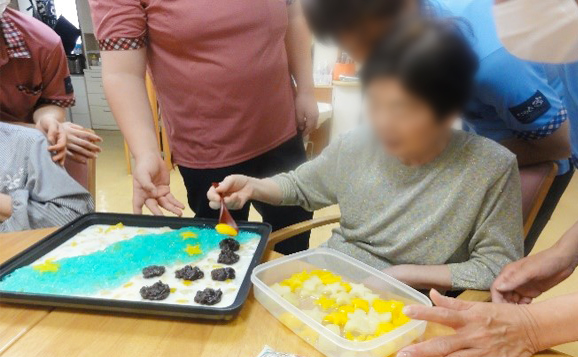 たなばたさまでは鮮やかな色のゼリーをつくり皆様で食べました。