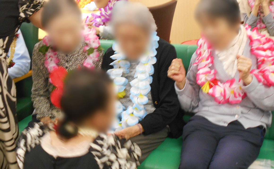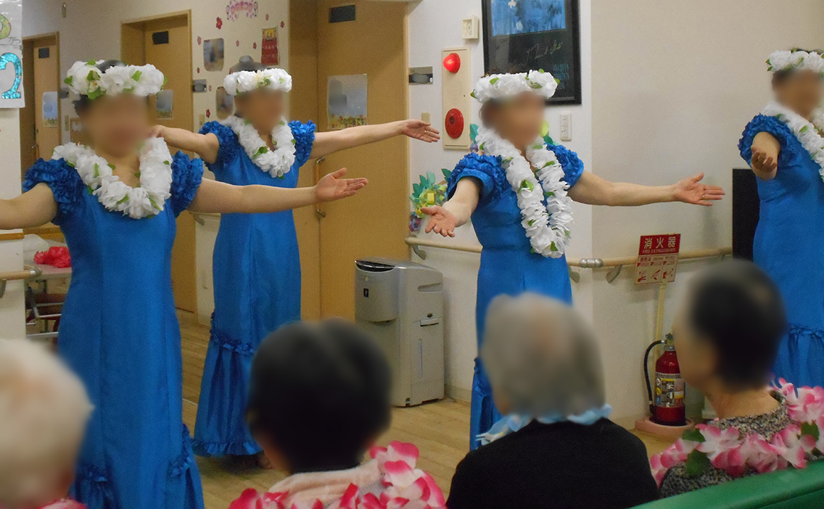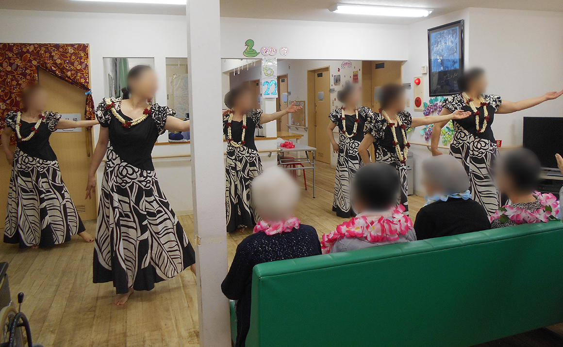 ケア21のフラダンス部の皆様が訪問してくださいました♪ 鮮やかな衣装と最高の笑顔で、いつものリビングがパッと華やかな空間に☆ 「フラダンス好きなの」 「知っている曲があってうれしかった」 「ハワイに旅行したことを思い出した」などなど、 みなさんとても満喫されておりました。 公演中に一人一人にレイをかけて下さり、公演後には一人一人に声をかけて下さいました。 あたたかい気持ちに触れ、感激☆ 素敵な時間をありがとうございました♪
