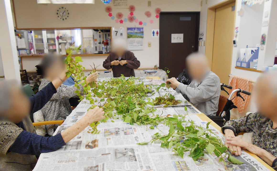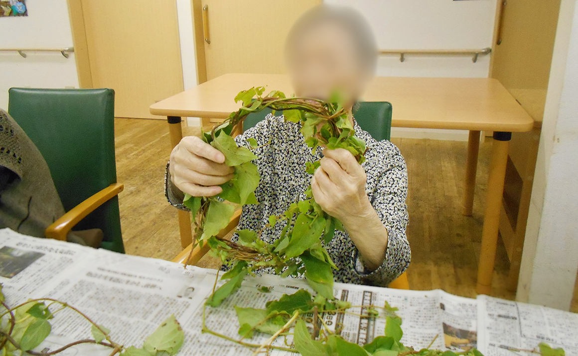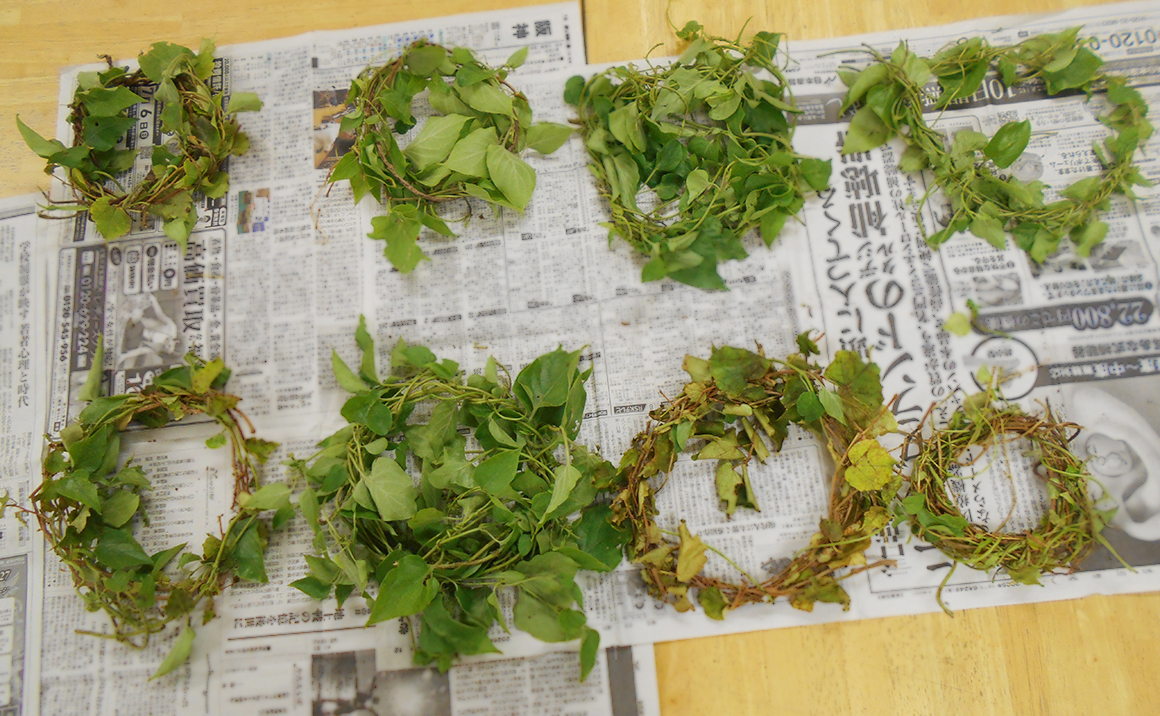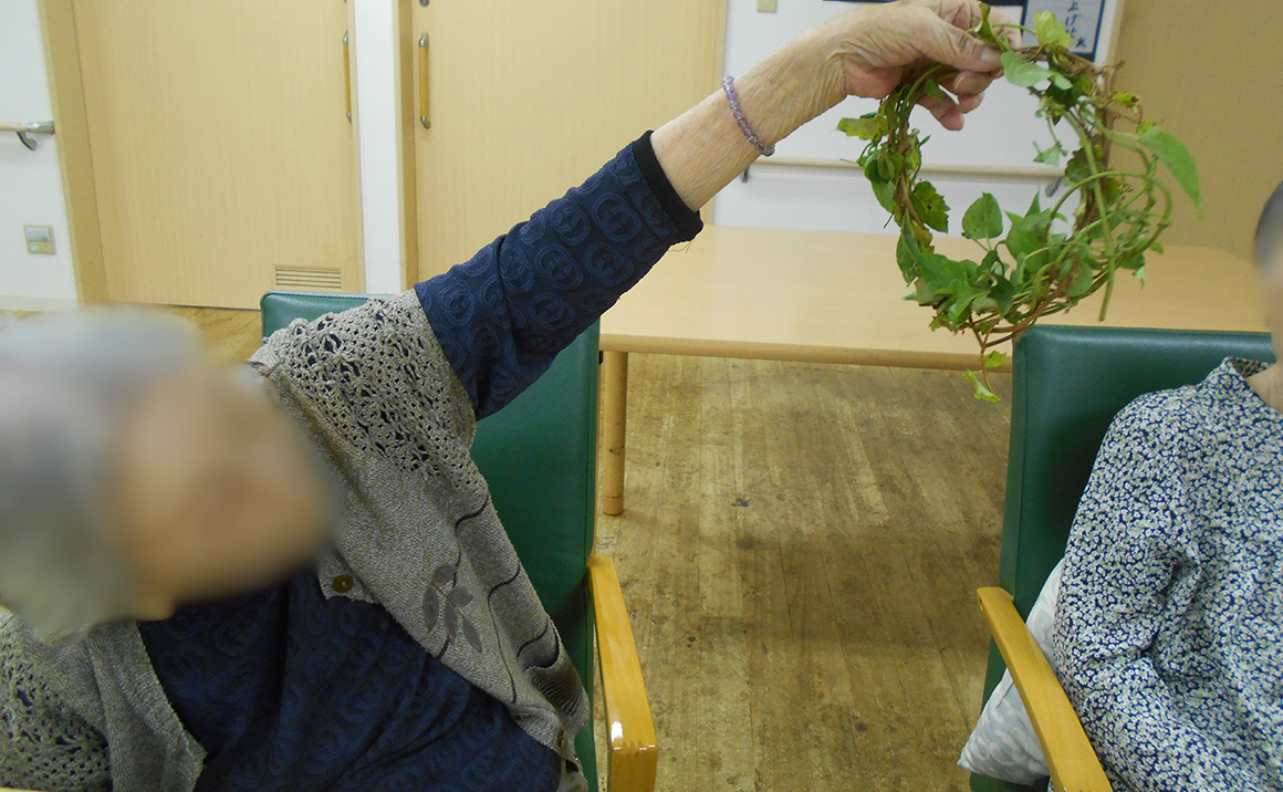 施設の駐車場に生えている身近な野草を使って「つる草のリース作り」をしました。 作り方はシンプルです☆ つる草をくるくる巻いてわっかを作り、ねじって巻いていけばリースの出来上がり。 葉っぱをすべて取り除いて作った方や、葉っぱをたっぷりつけてリースを作った方、ほどほどに整えて作られた方、など それぞれの感性が光っていました。 つる草を触っていると、子供の頃に遊んだ感覚がよみがえってきたのか、 みなさん無心になって気持ちよさそうに、いつまでもつる草に触れていました。