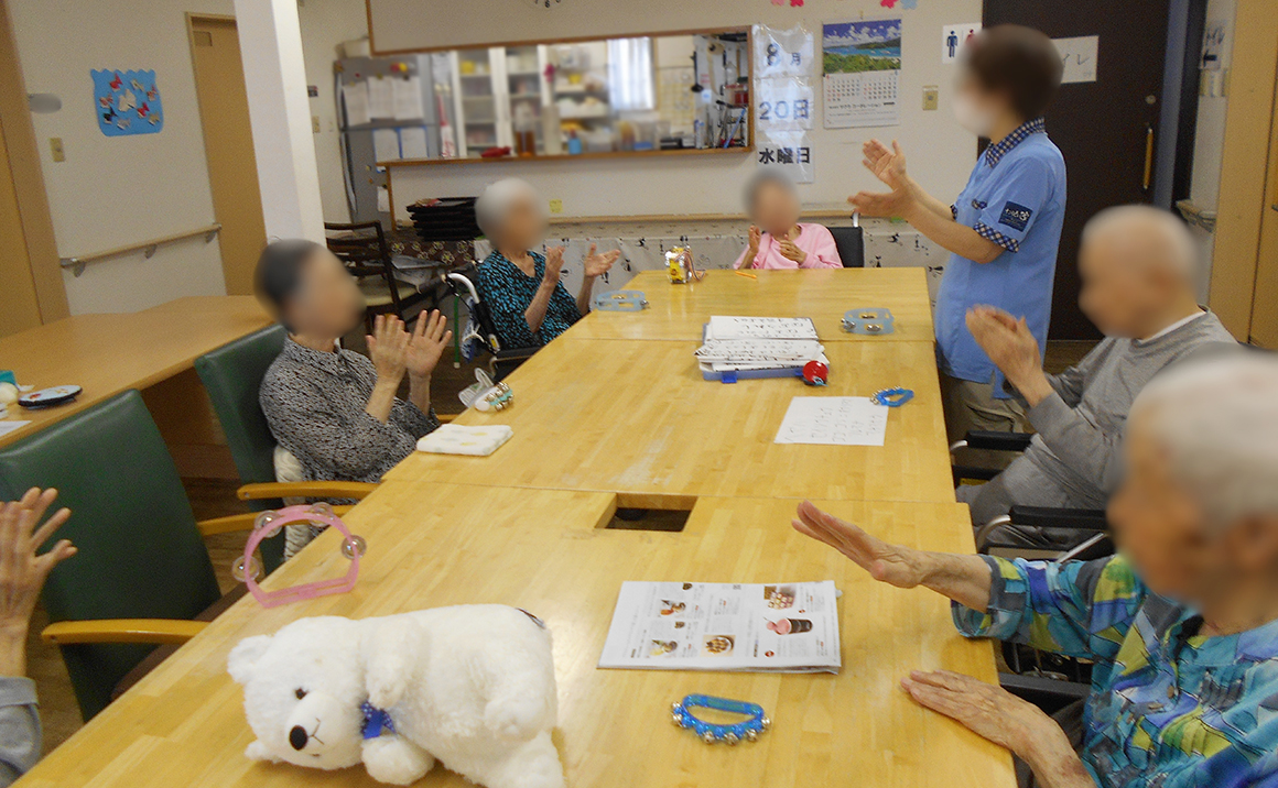 タンバリンに鈴、ちっちゃい太鼓・・・ 音を鳴らしてみるとスカッとした気分にもなって、自然と表情もほぐれます♪ リズムに合わせて手を動かして音を出すことで、脳の複数の部位を同時に刺激できて脳トレ効果も♪ はじめはそれぞれバラバラでチグハグなリズムでも、繰り返ししているうちに、 だんだん揃ってきて、なんだかちょっと一体感も味わえます。 最後は楽器を横に置いて、クマのぬいぐるみが転ぶほどの手拍子で「青い山脈」を大合唱♪