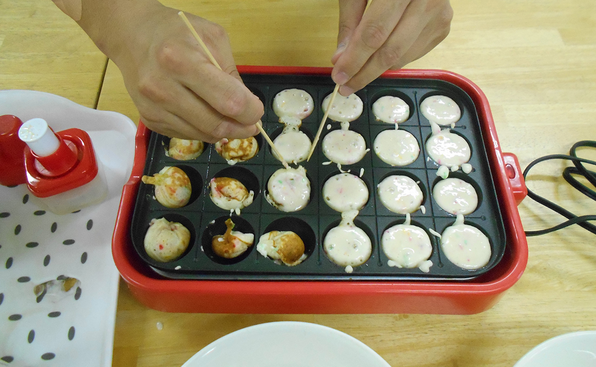 たこ焼き器でカステラを作りました。 ホットケーキミックスにバナナとスプレーチョコを入れた、チョコバナナ味と お抹茶を混ぜた抹茶味の2種類を作りました。 チョコバナナ味の方は、写真の通り、 スプレーチョコの赤と緑が溶けず、紅ショウガとネギに見えるため、見た目がまるでたこ焼き。 でもお味は、バナナが入って、もっちりした食感でおいしかったです♪ 抹茶味の方は、自然な甘さで、食べやすい、と好評でした♪ 出来立てホカホカをお味見しながら、わいわいたのしく作ることができました。