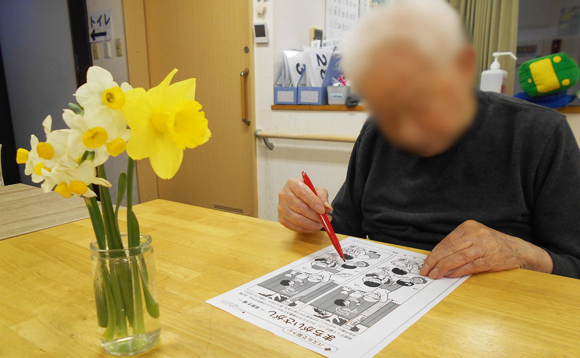 今年も春を告げに、花壇の水仙が咲きました。 水仙の香りを届けたくて、摘んで、テーブルに飾りました。 実は水仙の香りには、リラックス効果や抗酸化作用があるとされています。 お花が好きな方が多いので、「お花があると部屋の雰囲気が変わるねぇ」と目をキラキラさせて喜んでくださいました。 写真は、脳トレのプリントをされている普段のリビングの様子と水仙のお花です。