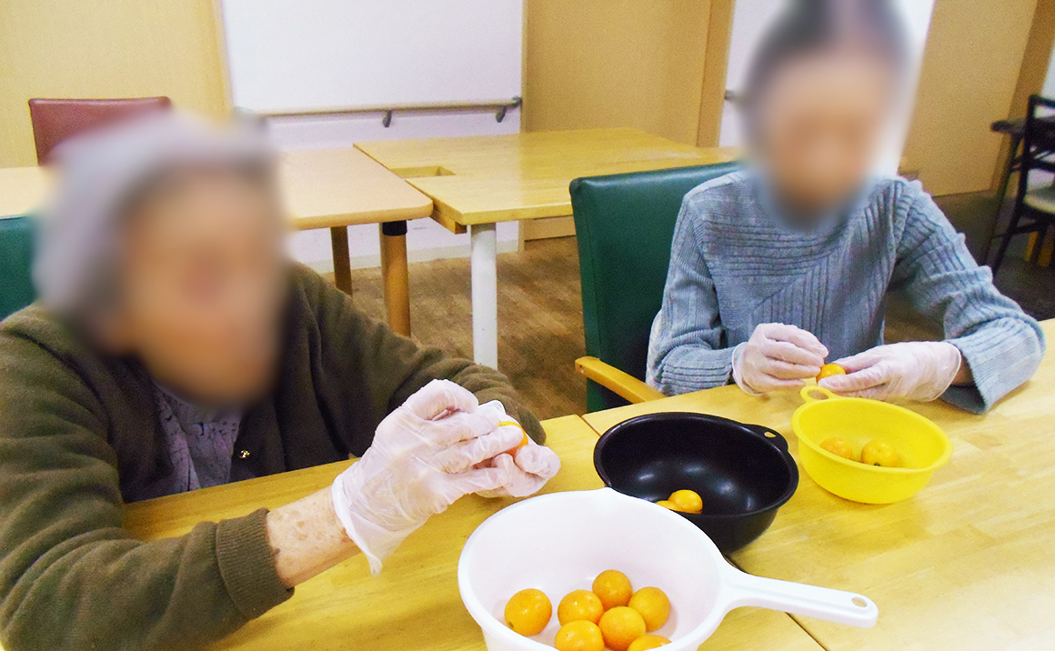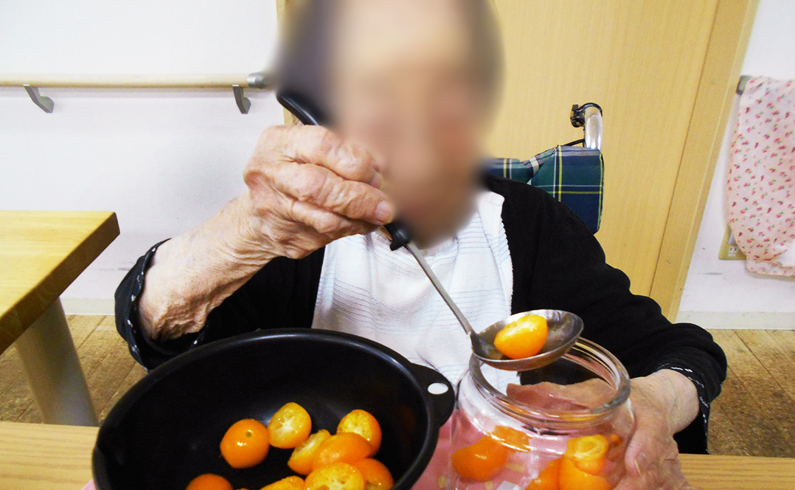季節の手仕事、金柑のハチミツ漬けを作りました。 金柑に爪楊枝で数か所つついてから、沸騰したお湯で5分茹でます。 半分に切って種を取り出して、ハチミツを上からひたひたに注いだら出来上がり。 金柑は咳、痰、喉の炎症を鎮める働きがあり、喉ケアに最適! 昔ながらの薬膳レシピです。 できあがりは、3時のおやつのお茶うけでいただきました。 おやつの後の歌唱レクリエーションでは、みなさん普段より「ええ声~♪」で歌えたような気がします☆