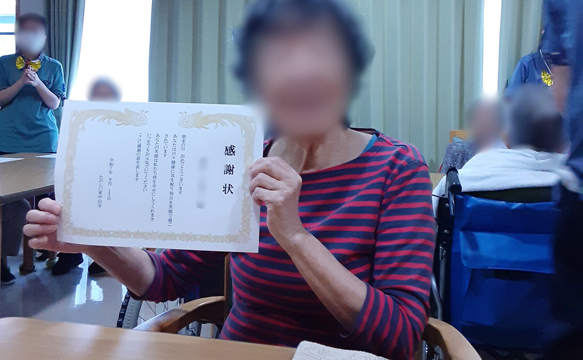 グループホームたのしい家中山寺のブログ御覧いただきありがとうございます。 9月は敬老会と100歳の誕生会を開催しております。 たのしい家中山寺で100歳になられたのは初めてのことなので職員と入居者様皆さまでお祝いをさせていただきました。 敬老会では皆さまに日頃の感謝を込めて感謝状を手渡させていただきました。