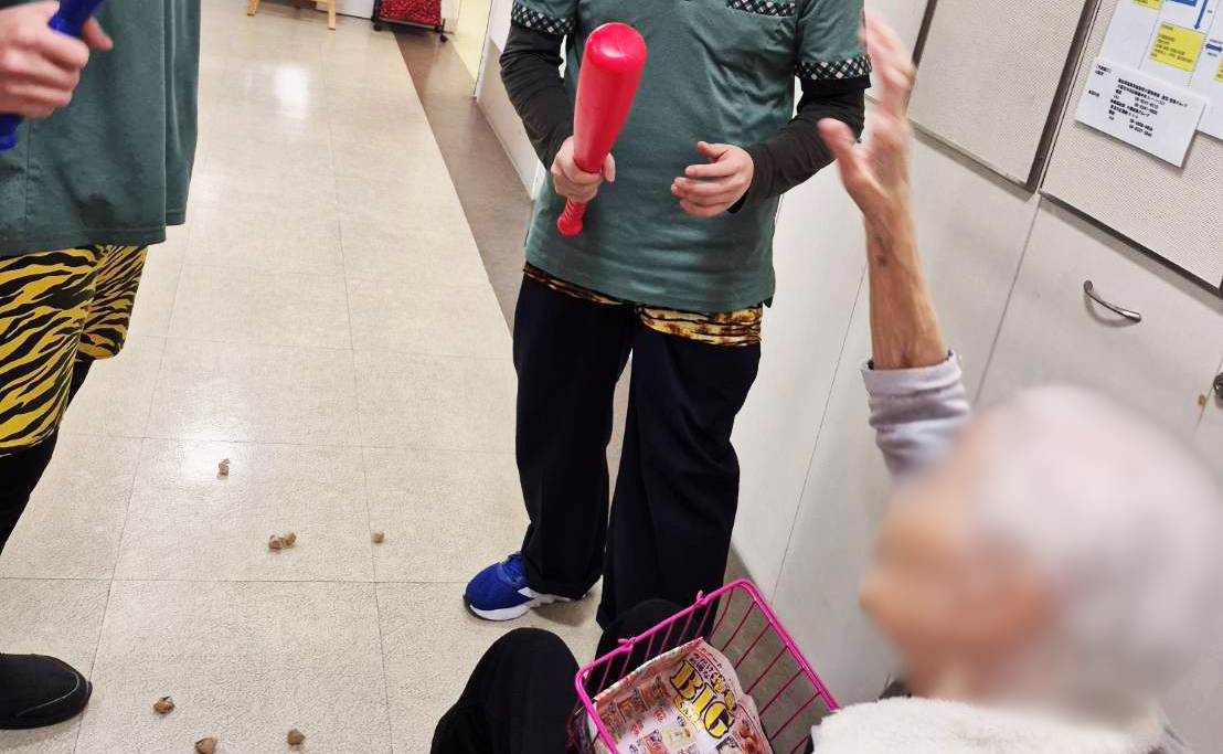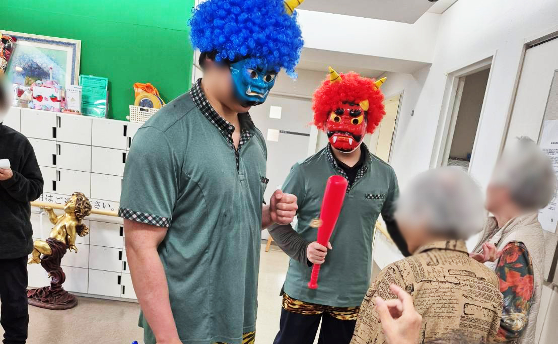 訪室するとご利用者さまから「え?だれ?鬼が来たわ 怖いわ」と練習通りに鬼を演じて大成功♪