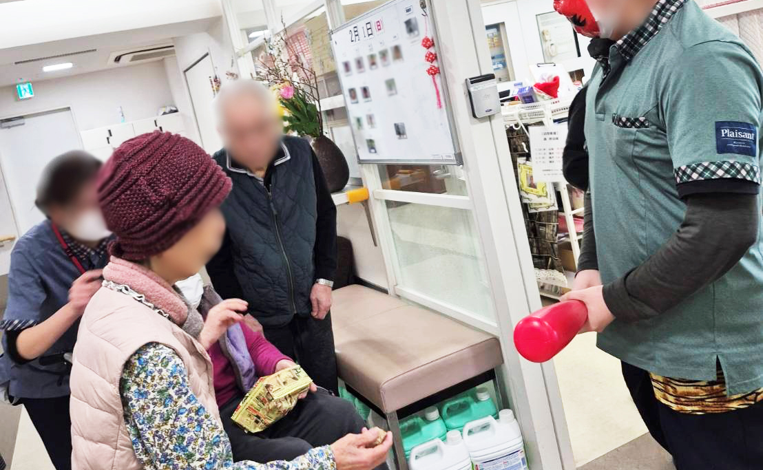 「鬼は外、福は内」の声に合わせ、季節の行事を楽しんでいただきました。声掛けを一緒に楽しんだり、スタッフが作った豆を手に取って季節を感じたりと皆様の