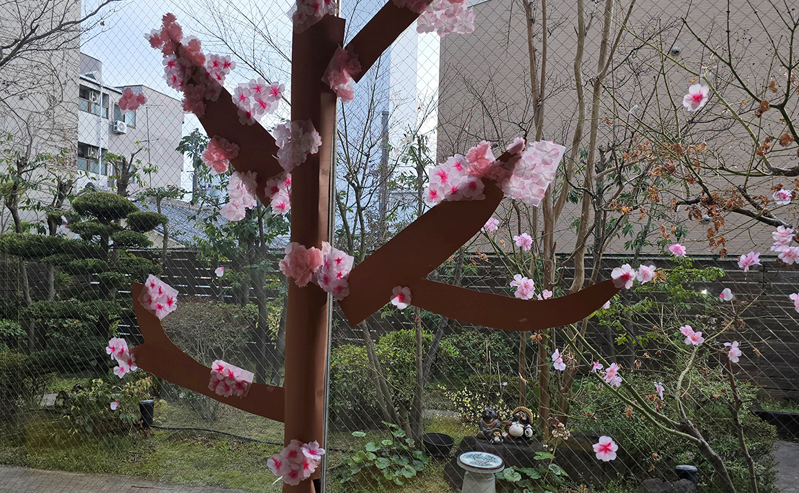 プレザンメゾン東淀川大隅では皆さまにも春を感じて頂きたく、スタッフの手づくりの桜やフェルトを使い桜をイメージしたものを窓に貼らせて頂きました。