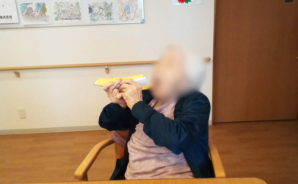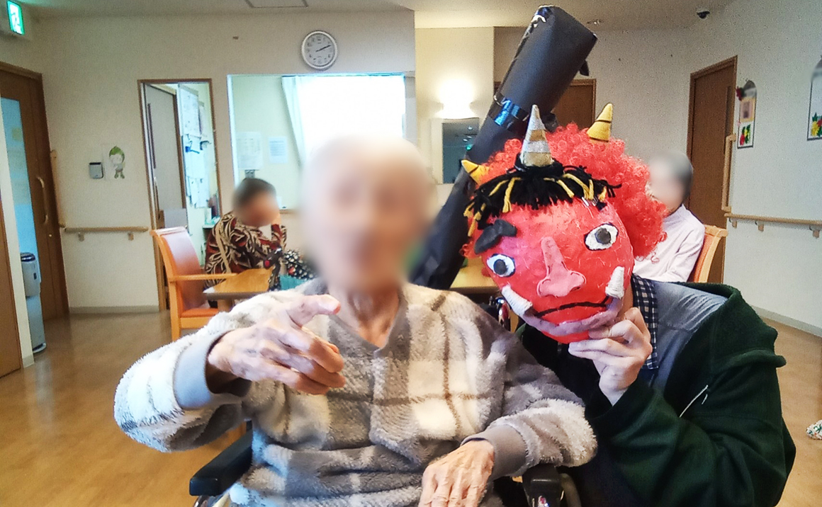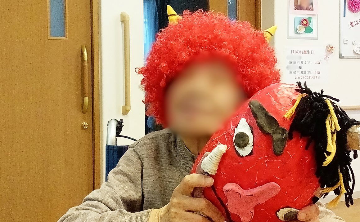 たのしい家梅津では2月に節分を行いました。 管理者が鬼に扮して皆様には豆に見立てた丸めた新聞紙を丸めて鬼は外ーをして頂きました♪ おやつには恵方巻の代わりに恵方巻っぽいロールケーキを購入し南南東を向いて食べて節分らしさを感じて頂けるようにしました。