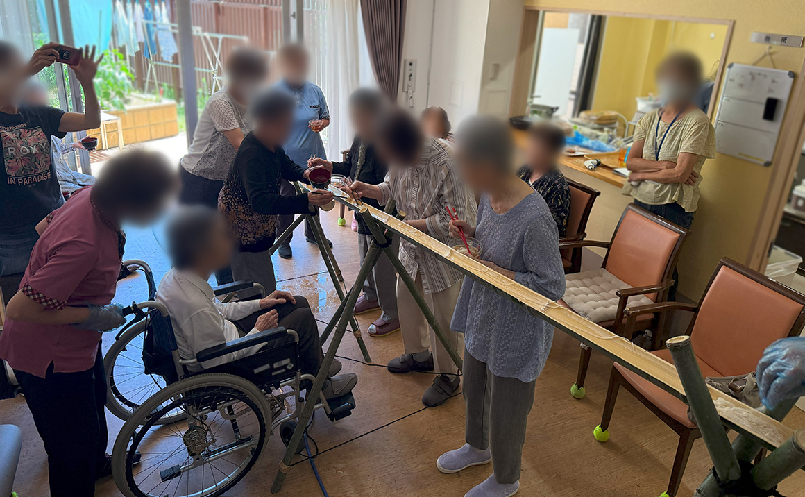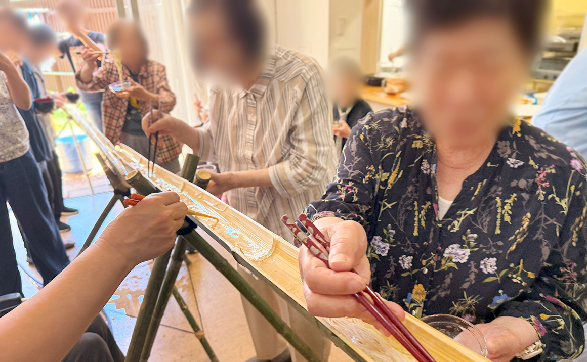 スタッフも一緒になって流れてくるおそうめんを一生懸命に取り ご入居者様に負けないぐらい食べておりました。