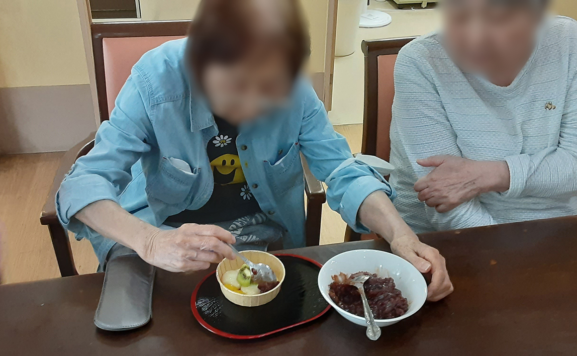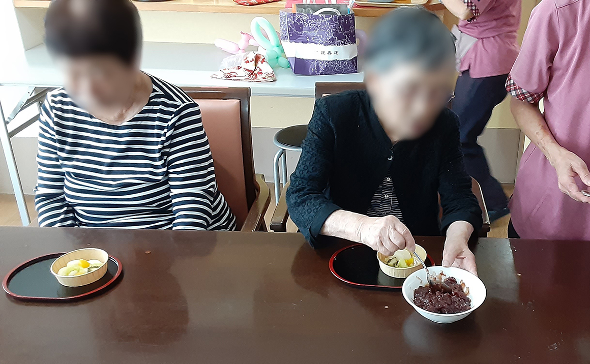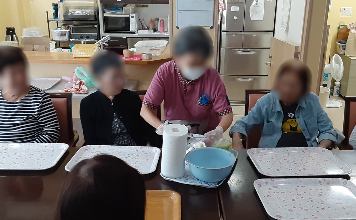 9月は敬老の日、日頃の感謝を込めて・・・・手作りのお菓子を皆様で作りました。 型を取りながら食べて言いの?と飾る前から皆様食べる事に夢中・・・ お団子は皆様で丸めて互いに大きのができたわねと言いながら形を整え、出来たらおさらに盛り付け・・ しかし、もう待ちきれず盛り付ける前に食べてしまわれた方も・・・ 皆様で笑いながらで作りあげて敬老のお祝い行いながら、楽しい時間を過ごせました。