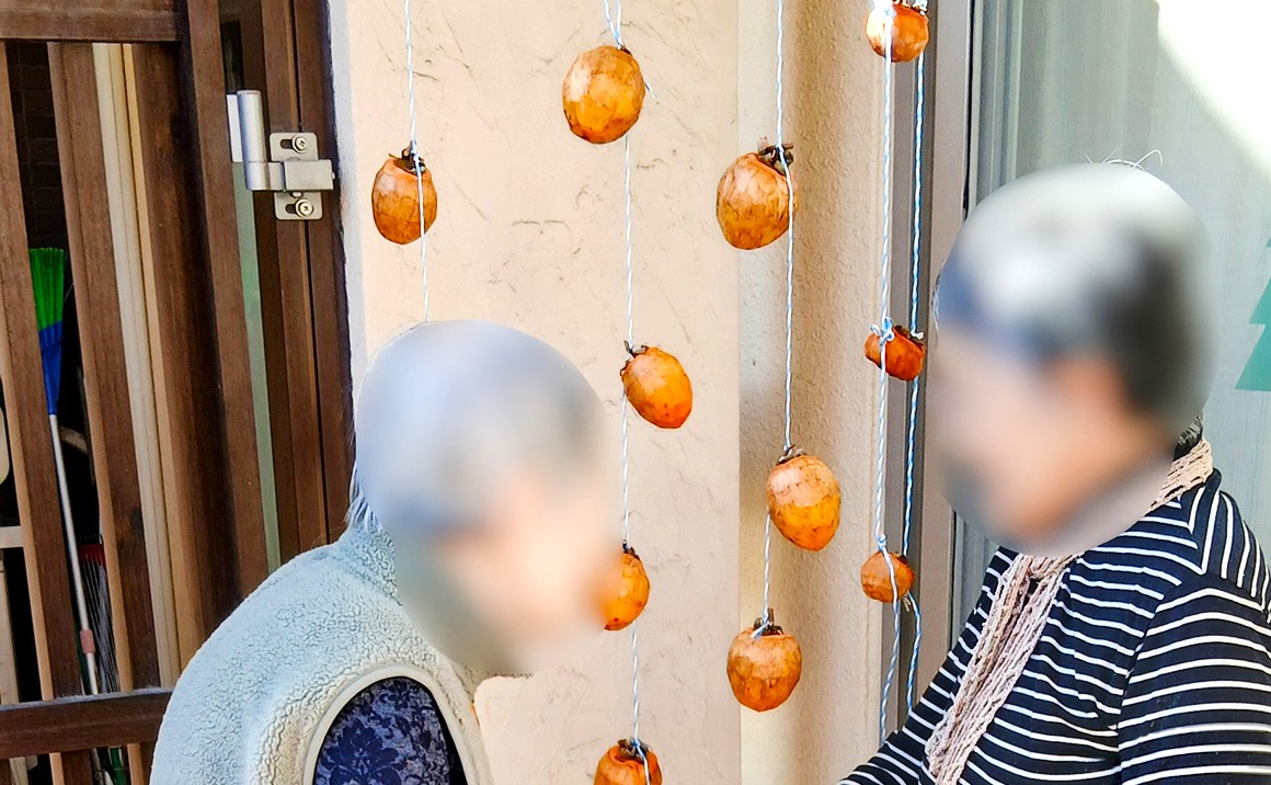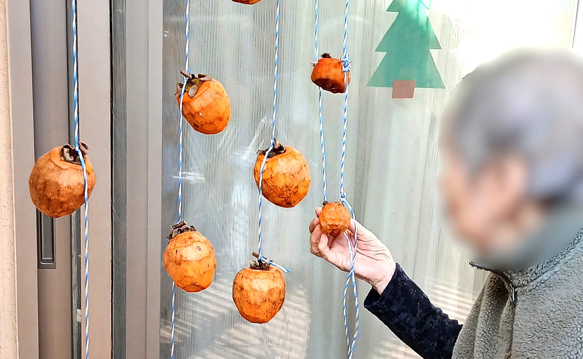 12月ご入居者とのお話で 干し柿を作る事にチャレンジしました。 干し柿を「道の駅」で購入してきました。 その後施設で下記の皮を向き、柿の干し方をなどを、皆様にお聞きして作り、外に干しました。 毎日 ご入居者様とスタッフで柿の状態を見ては「いつ食べれるのかな・・・」と楽しみに見て」おります。 その時に 畑で「ニンニク・ソラマメ・ブロッコリー・大根・人参・サニーレタスの成長を楽しみにしております。