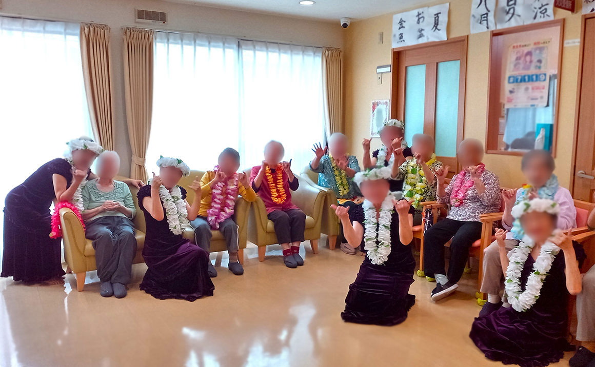 午後のレクリエーションタイムには、弊社のフラダンス部の方々に来て頂き素敵な衣装で、皆様の前でフラダンスを披露して下さいました。