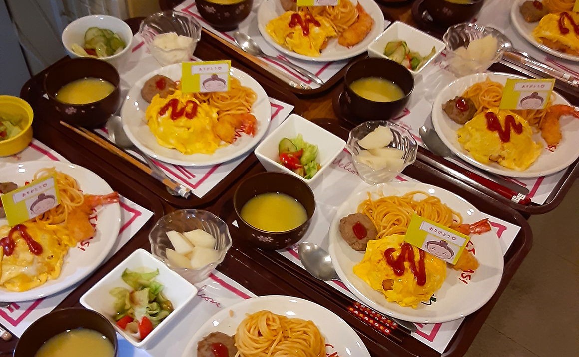 昼食には、エビフライ、オムライスやハンバーグ、スパゲッティ等を盛り合わせた手作り奥様ランチを提供しました。