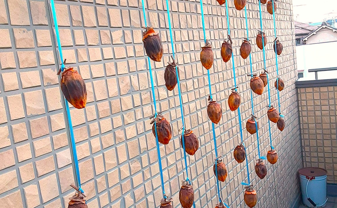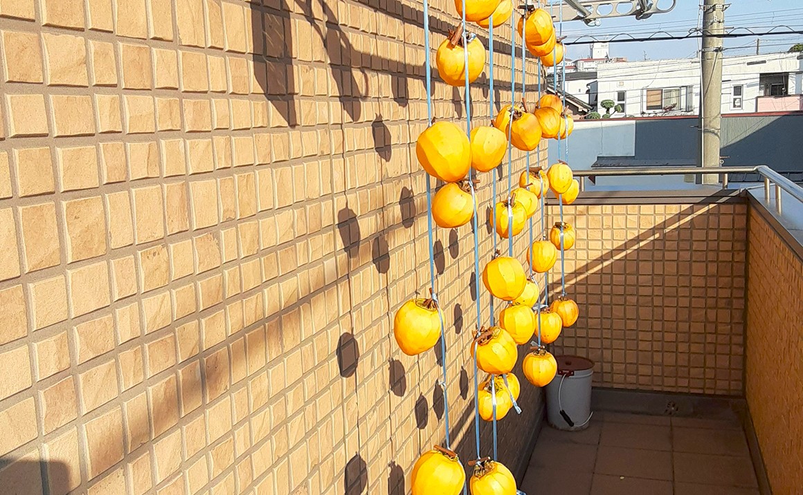 剥いた柿を2Fのベランダに吊るしました。