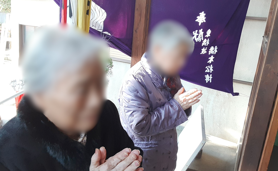境内までゆっくりと歩かれ、冬の澄んだ空気を感じながら手を合わせて静かにお願い事をされていました。