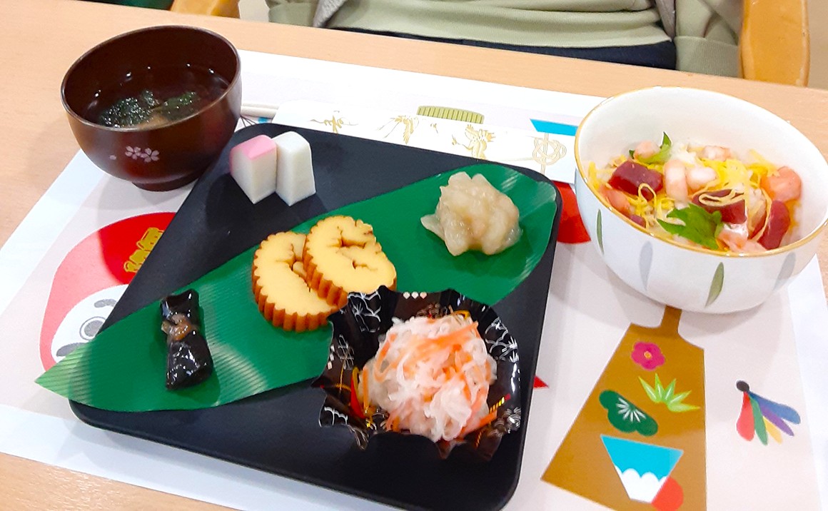 昼食には、おせち、赤飯、ちらし寿司をご用意しました。