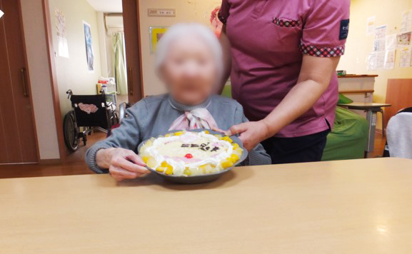 3月もお誕生日を迎えられた利用者様がいらっしゃいました♪ 職員はケーキを買うべきか作るべきか迷っていましたが少し不格好でも手作りにしましょうと言うことで せっせこお誕生日ケーキを作ってお祝いさせていただきました。 見た目は・・・ですが・・・職員の愛情がたっぷり詰め込まれたケーキと息子様から贈られた縫いぐるみで記念撮影。 N様、いつまでも透き通る白いお肌を維持して笑顔で一年過ごせるよう、願っております♪