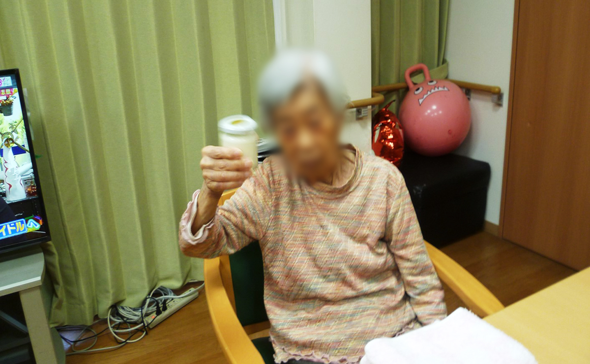 木川東の男性利用者様は、今は1階にお一人となりました。 お祝い、何にしようかと相談し、牛丼と手作りバターで食べるおやつにしました。 生クリームその他もろもろを瓶に入れ、シェィクシェイク。 ご利用者様には小さな空き瓶を振ってもらってバター完成! なかなか良い感じのおやつになりました。 K様、優しいお父さんの笑顔でいつでもいてくださいね♪