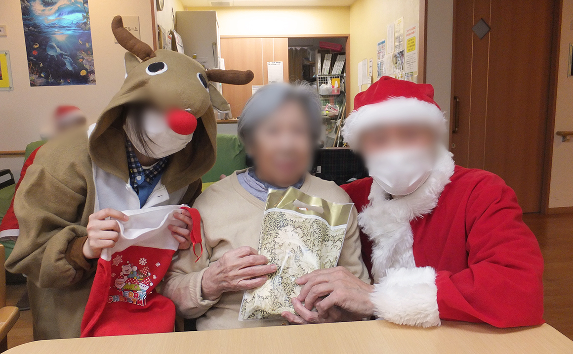 サンタさんからプレゼントを受け取る入居者様方 子供に戻られたように、満面の笑みでした♪