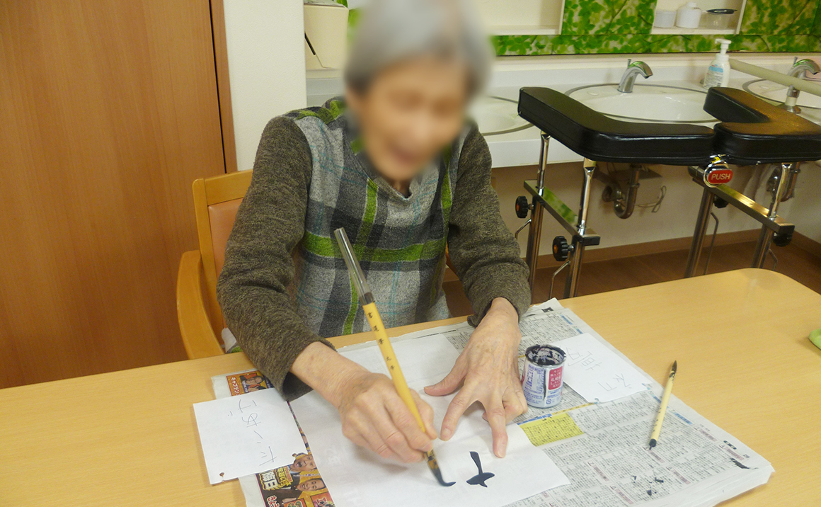 たのしい家木川東の1階の元旦の様子をお届けいたします。 お昼ご飯に、ステーキメインのお節料理を召し上がって頂き その後、レクリエーションで書初め大会を行いました。