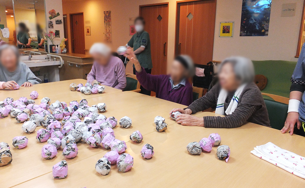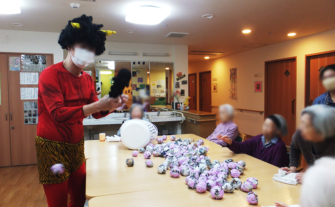 昨年と違って、小さく硬く固めた新聞豆を投げる投げる! 鬼役の職員も楽しんで鬼役を演じてくれたので大きな笑い声と笑顔で素敵なレクリエーションとなりました。